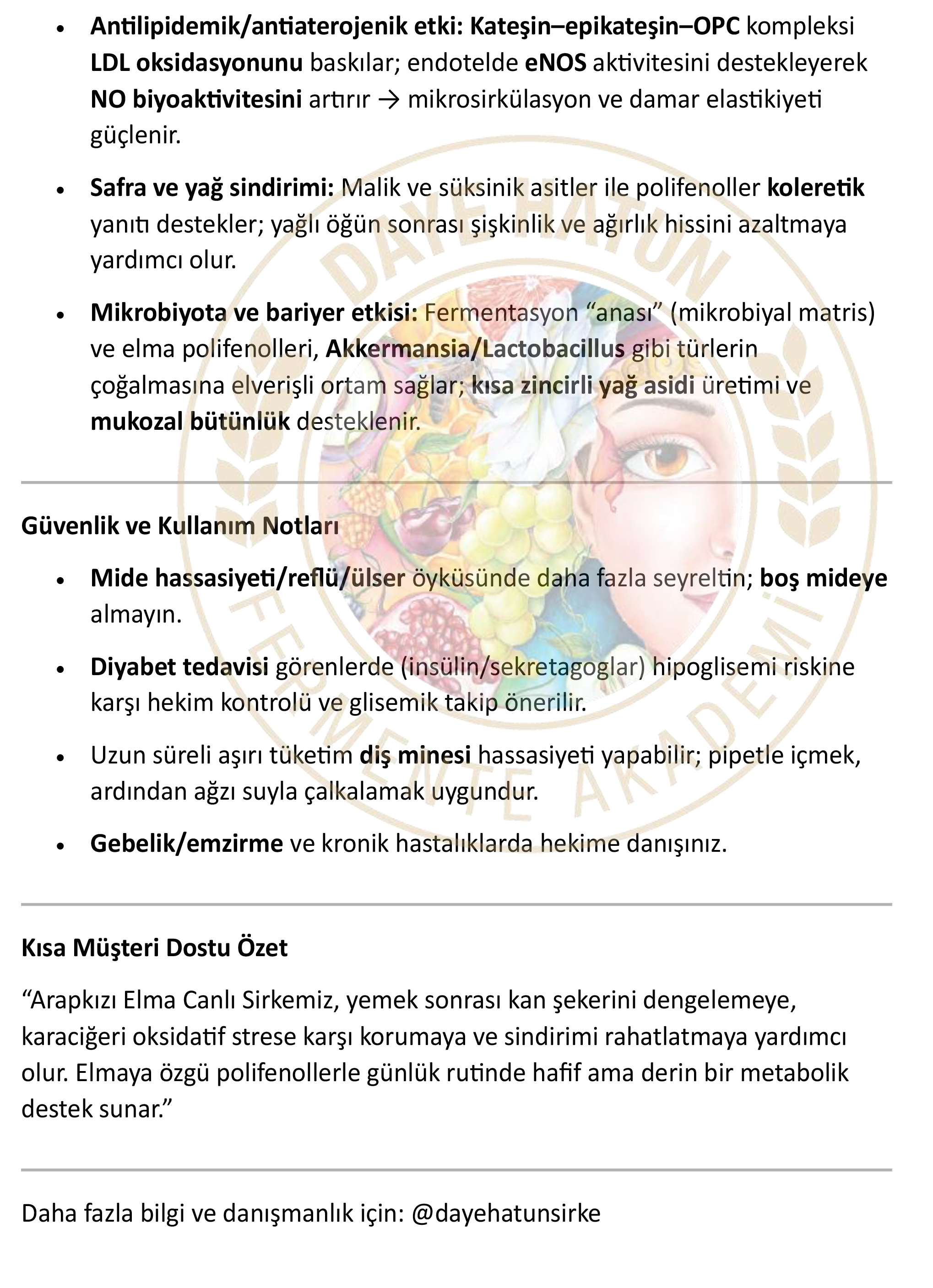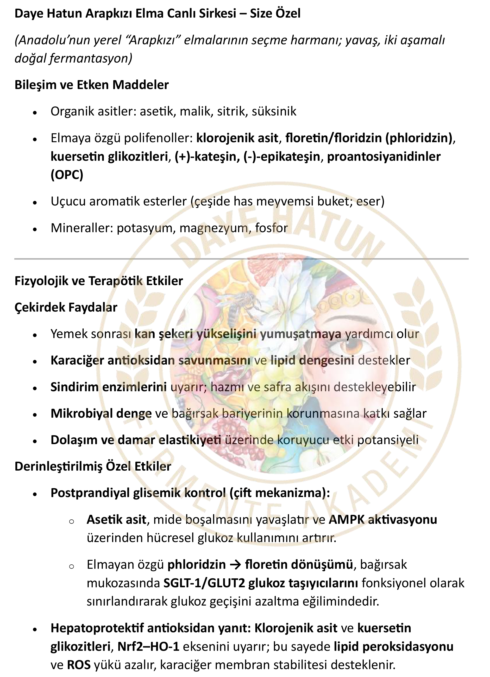 Üründen bağımsız olarak standardına uygun fermente edilmiş canlı sirkelerin çok çeşitli sağlık yararları olduğu bilimsel çalışmalarla ispatlanmış durumdadır. Bu temel faydaların yanında yapıldığı ürüne göre de farklı şifalarının tespitleri konusunda araştırmalar halen sürmektedir, Daye Hatun sirkeleri de “canlı sirke” olduğu için tüm bu faydaları ve çok daha fazlasını bünyesinde barındırmaktadır.