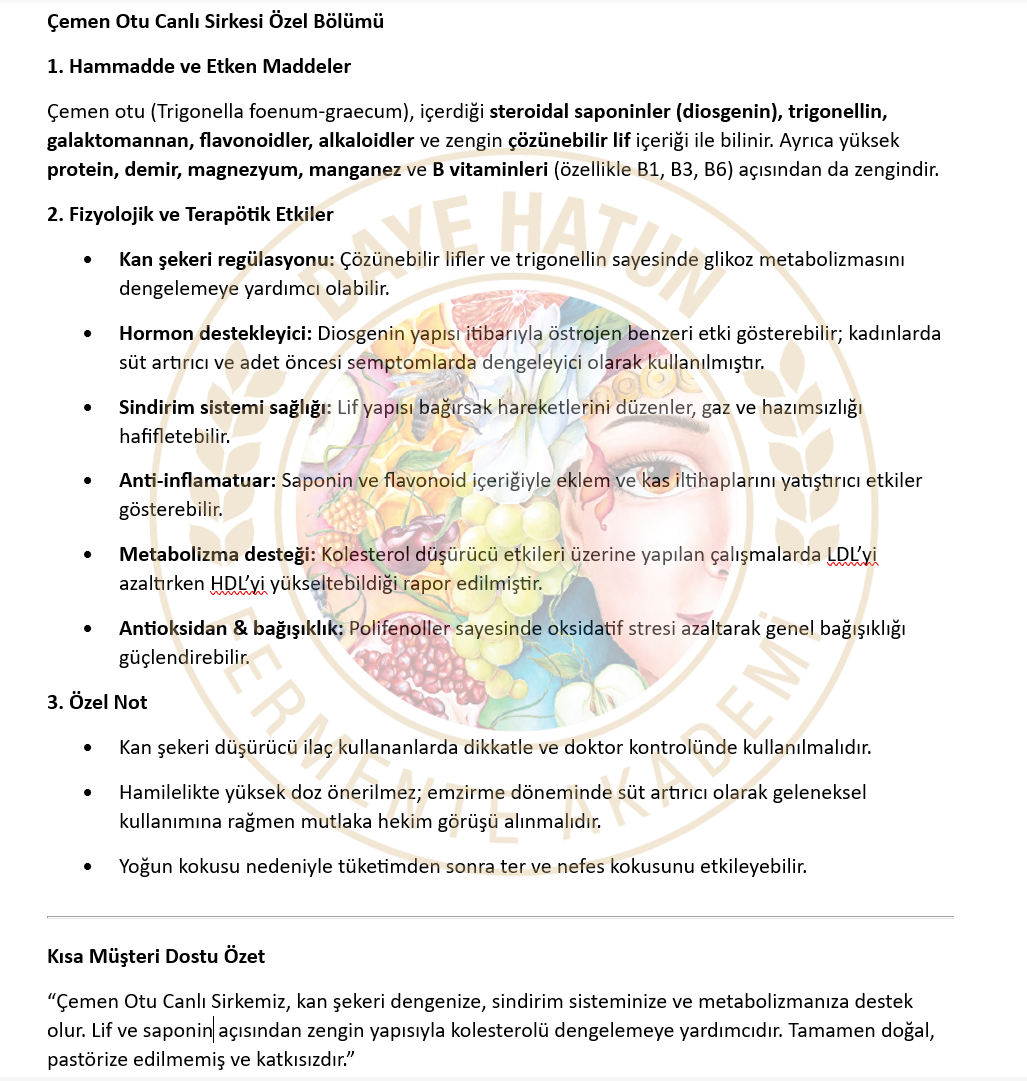 Üründen bağımsız olarak standardına uygun fermente edilmiş canlı sirkelerin çok çeşitli sağlık yararları olduğu bilimsel çalışmalarla ispatlanmış durumdadır. Bu temel faydaların yanında yapıldığı ürüne göre de farklı şifalarının tespitleri konusunda araştırmalar halen sürmektedir, Daye Hatun sirkeleri de “canlı sirke” olduğu için tüm bu faydaları ve çok daha fazlasını bünyesinde barındırmaktadır.