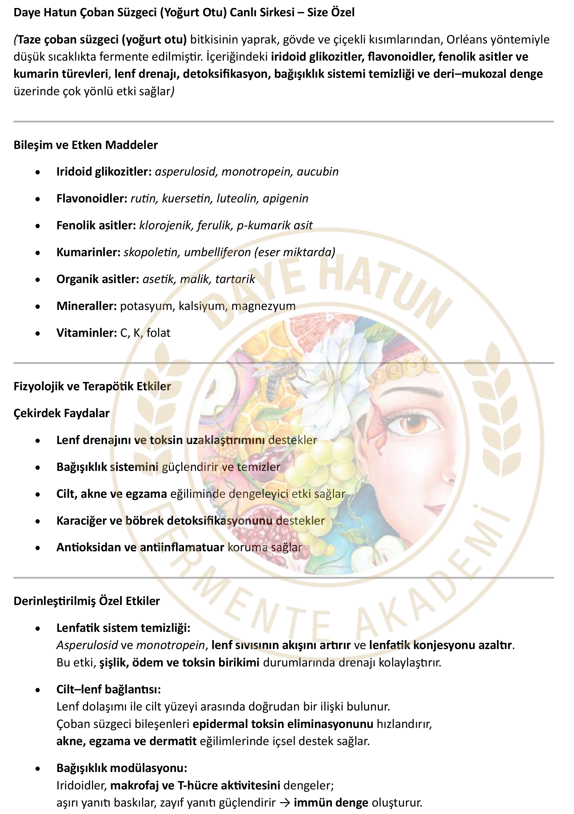Üründen bağımsız olarak standardına uygun fermente edilmiş canlı sirkelerin çok çeşitli sağlık yararları olduğu bilimsel çalışmalarla ispatlanmış durumdadır. Bu temel faydaların yanında yapıldığı ürüne göre de farklı şifalarının tespitleri konusunda araştırmalar halen sürmektedir, Daye Hatun sirkeleri de “canlı sirke” olduğu için tüm bu faydaları ve çok daha fazlasını bünyesinde barındırmaktadır.