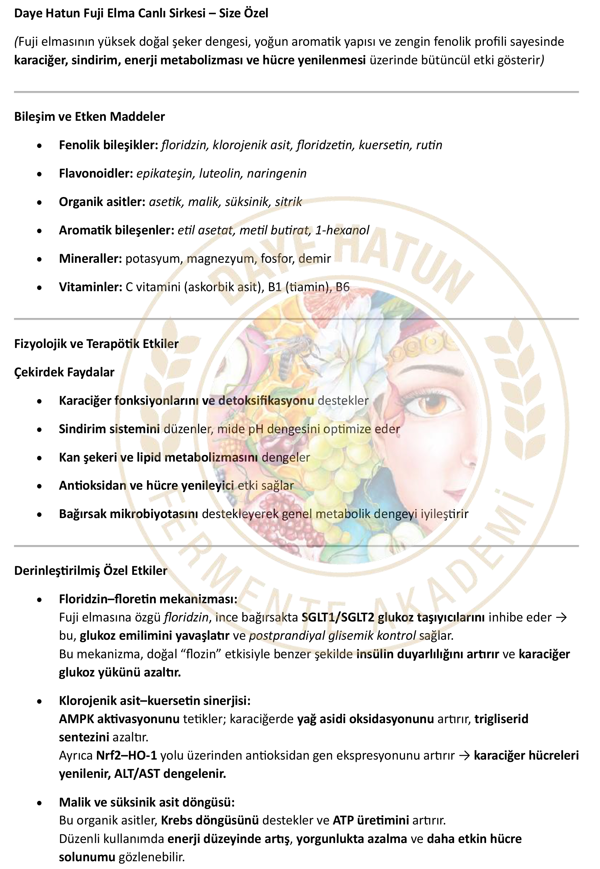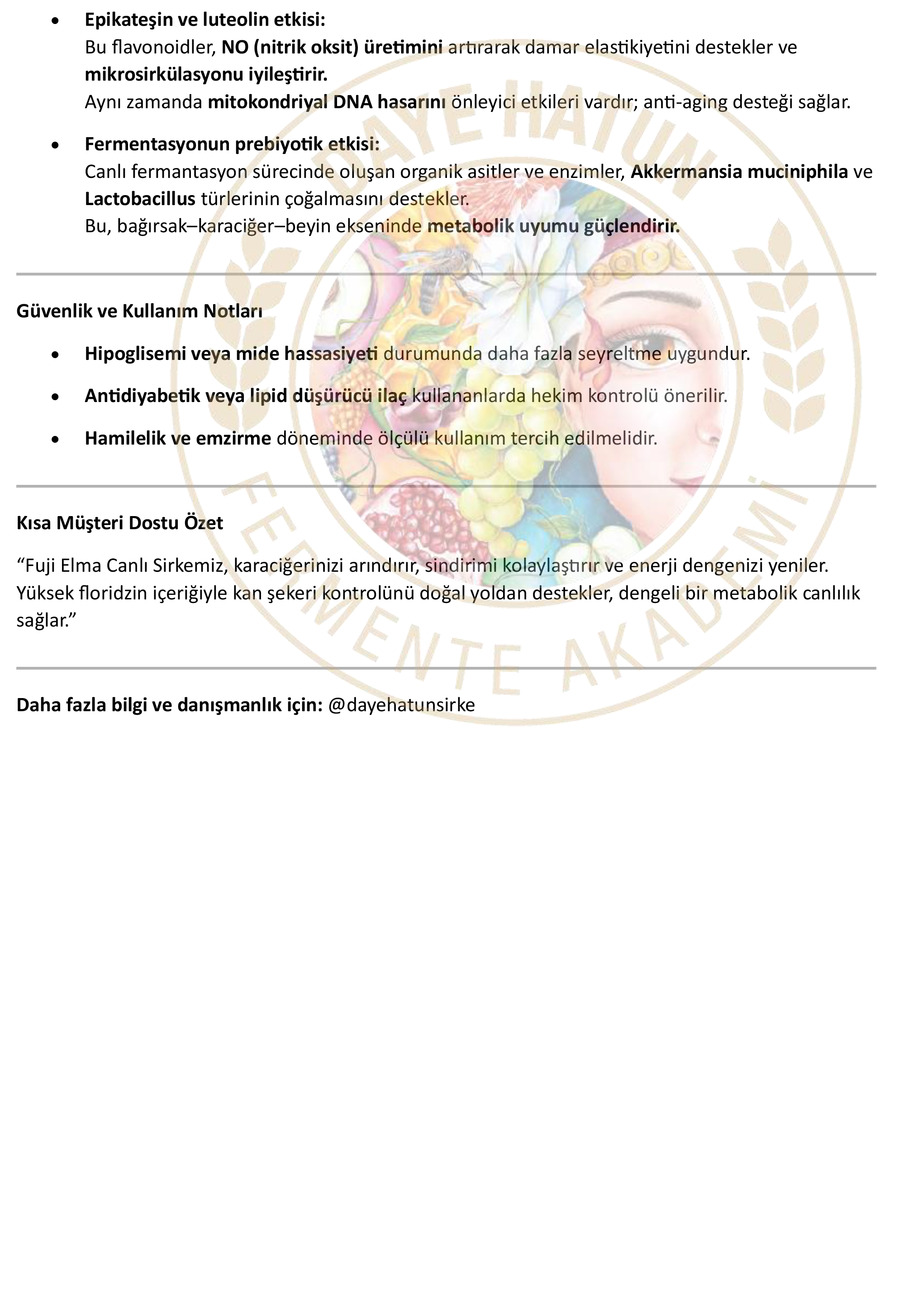 Üründen bağımsız olarak standardına uygun fermente edilmiş canlı sirkelerin çok çeşitli sağlık yararları olduğu bilimsel çalışmalarla ispatlanmış durumdadır. Bu temel faydaların yanında yapıldığı ürüne göre de farklı şifalarının tespitleri konusunda araştırmalar halen sürmektedir, Daye Hatun sirkeleri de “canlı sirke” olduğu için tüm bu faydaları ve çok daha fazlasını bünyesinde barındırmaktadır.