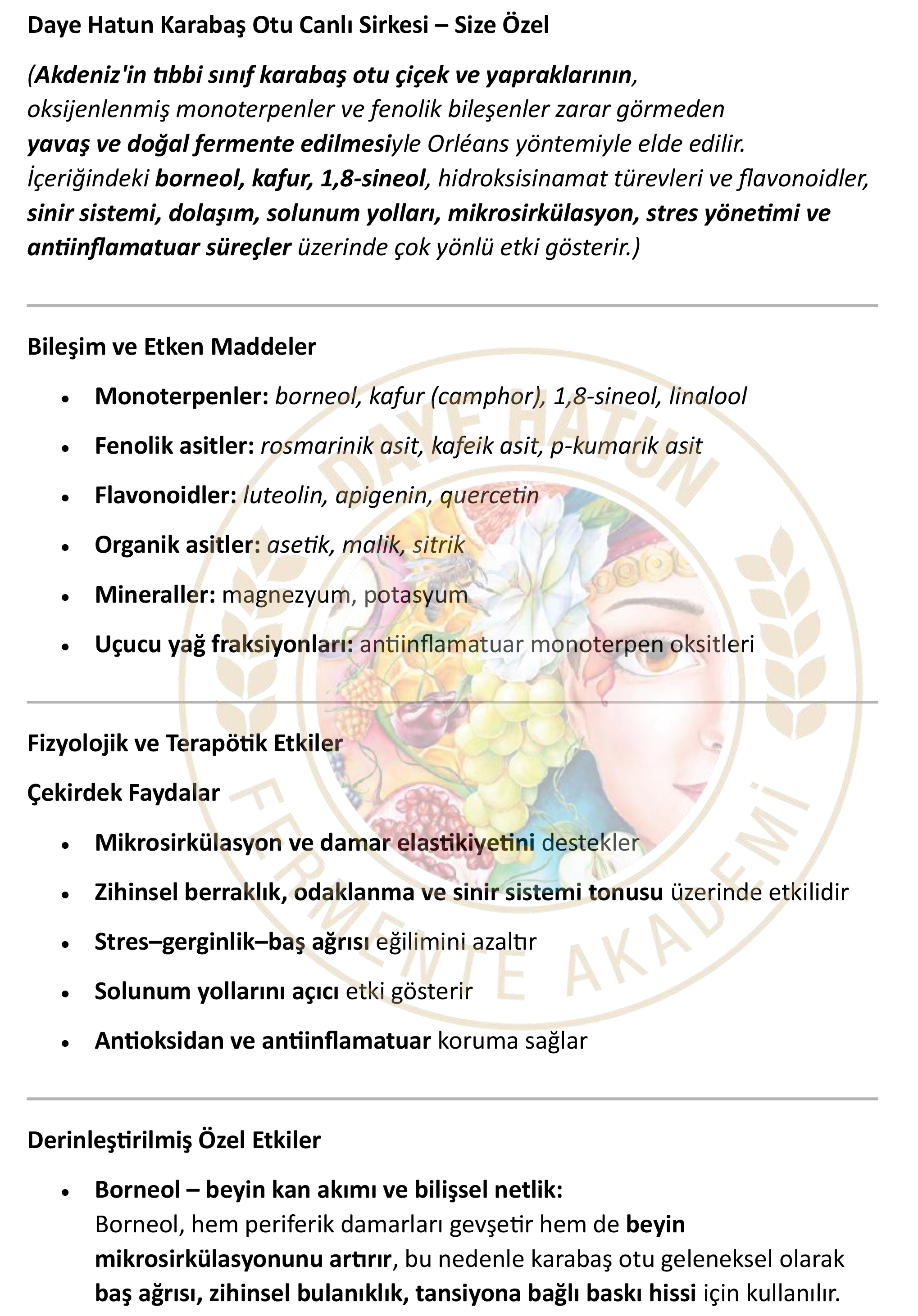 Daye Hatun canlı sirkeleri muhtelif oranlarda; triptofan, treonin, izolösin, lösin, lizin, metionin, sistin, fenilalanin, tirozin, valin, arginin, histidin, alanin, aspartik asit, glutamik asit, glisin, prolin ve serin gibi amino asitleri, A, B6 (piridoksin), folat, askorbik asit, tiamin, riboflavin, niasin ve pantotenik asit gibi vitaminleri ayrıca muhtelif miktarlarda kalsiyum, demir, magnezyum, fosfor, potasyum, çinko, bakır ve manganez gibi mineralleri de ihtiva etmektedir.