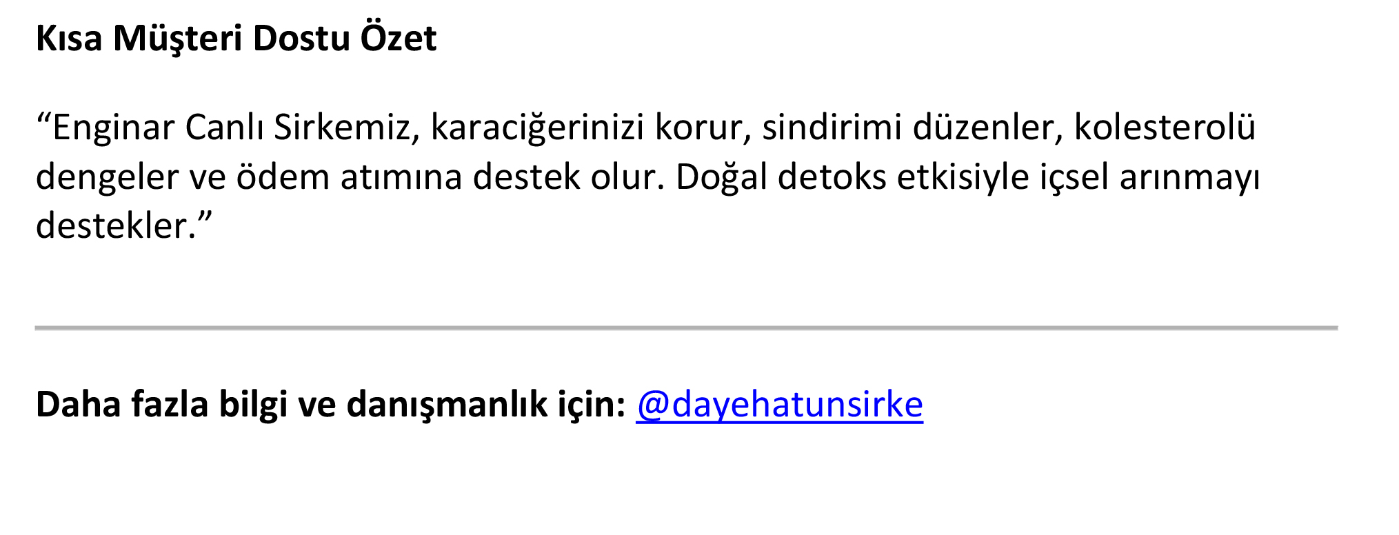 Üründen bağımsız olarak standardına uygun fermente edilmiş canlı sirkelerin çok çeşitli sağlık yararları olduğu bilimsel çalışmalarla ispatlanmış durumdadır. Bu temel faydaların yanında yapıldığı ürüne göre de farklı şifalarının tespitleri konusunda araştırmalar halen sürmektedir, Daye Hatun sirkeleri de “canlı sirke” olduğu için tüm bu faydaları ve çok daha fazlasını bünyesinde barındırmaktadır.