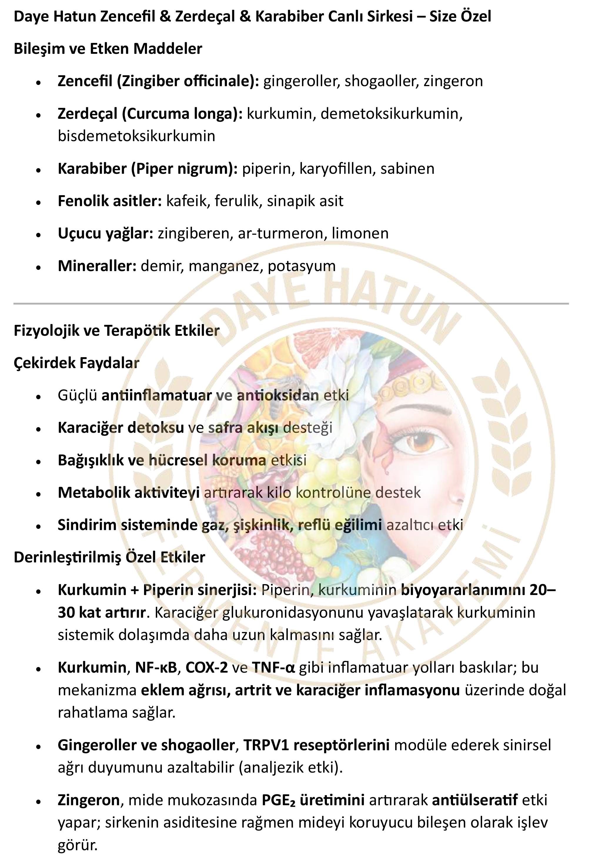Daye Hatun canlı sirkeleri muhtelif oranlarda; triptofan, treonin, izolösin, lösin, lizin, metionin, sistin, fenilalanin, tirozin, valin, arginin, histidin, alanin, aspartik asit, glutamik asit, glisin, prolin ve serin gibi amino asitleri, A, B6 (piridoksin), folat, askorbik asit, tiamin, riboflavin, niasin ve pantotenik asit gibi vitaminleri ayrıca muhtelif miktarlarda kalsiyum, demir, magnezyum, fosfor, potasyum, çinko, bakır ve manganez gibi mineralleri de ihtiva etmektedir.