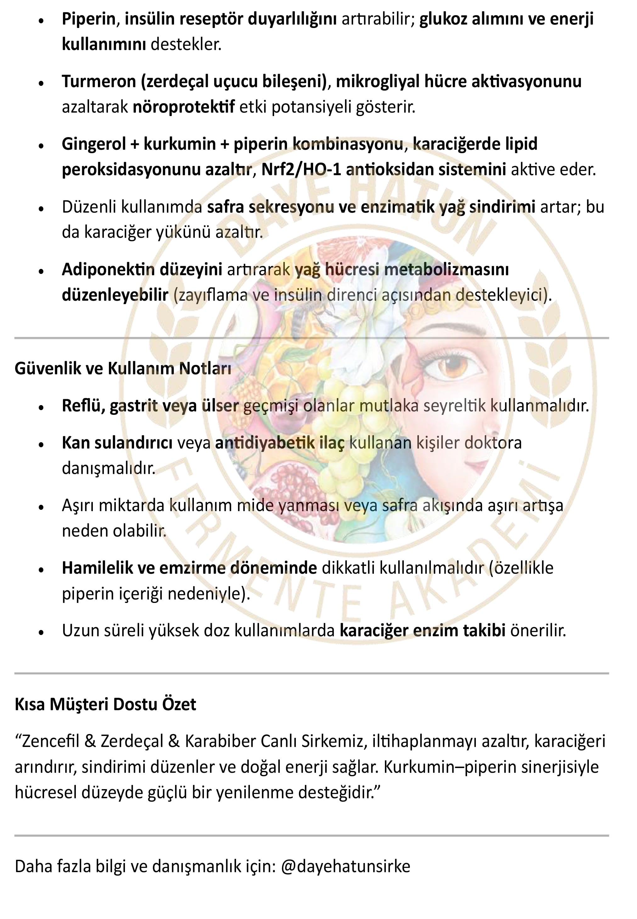 Üründen bağımsız olarak standardına uygun fermente edilmiş canlı sirkelerin çok çeşitli sağlık yararları olduğu bilimsel çalışmalarla ispatlanmış durumdadır. Bu temel faydaların yanında yapıldığı ürüne göre de farklı şifalarının tespitleri konusunda araştırmalar halen sürmektedir, Daye Hatun sirkeleri de “canlı sirke” olduğu için tüm bu faydaları ve çok daha fazlasını bünyesinde barındırmaktadır.